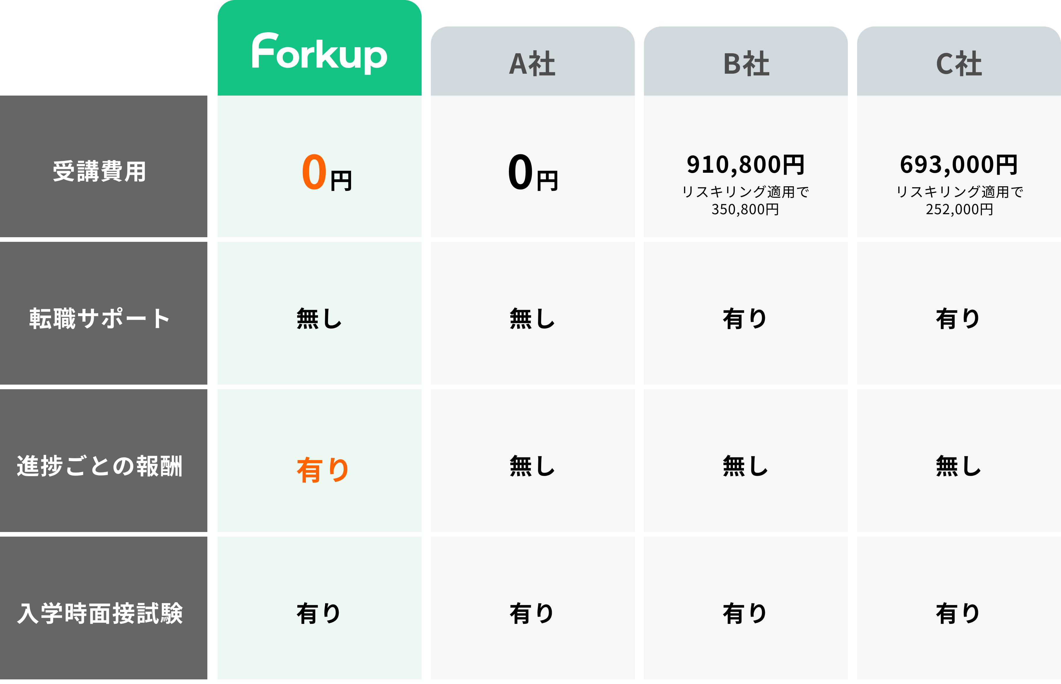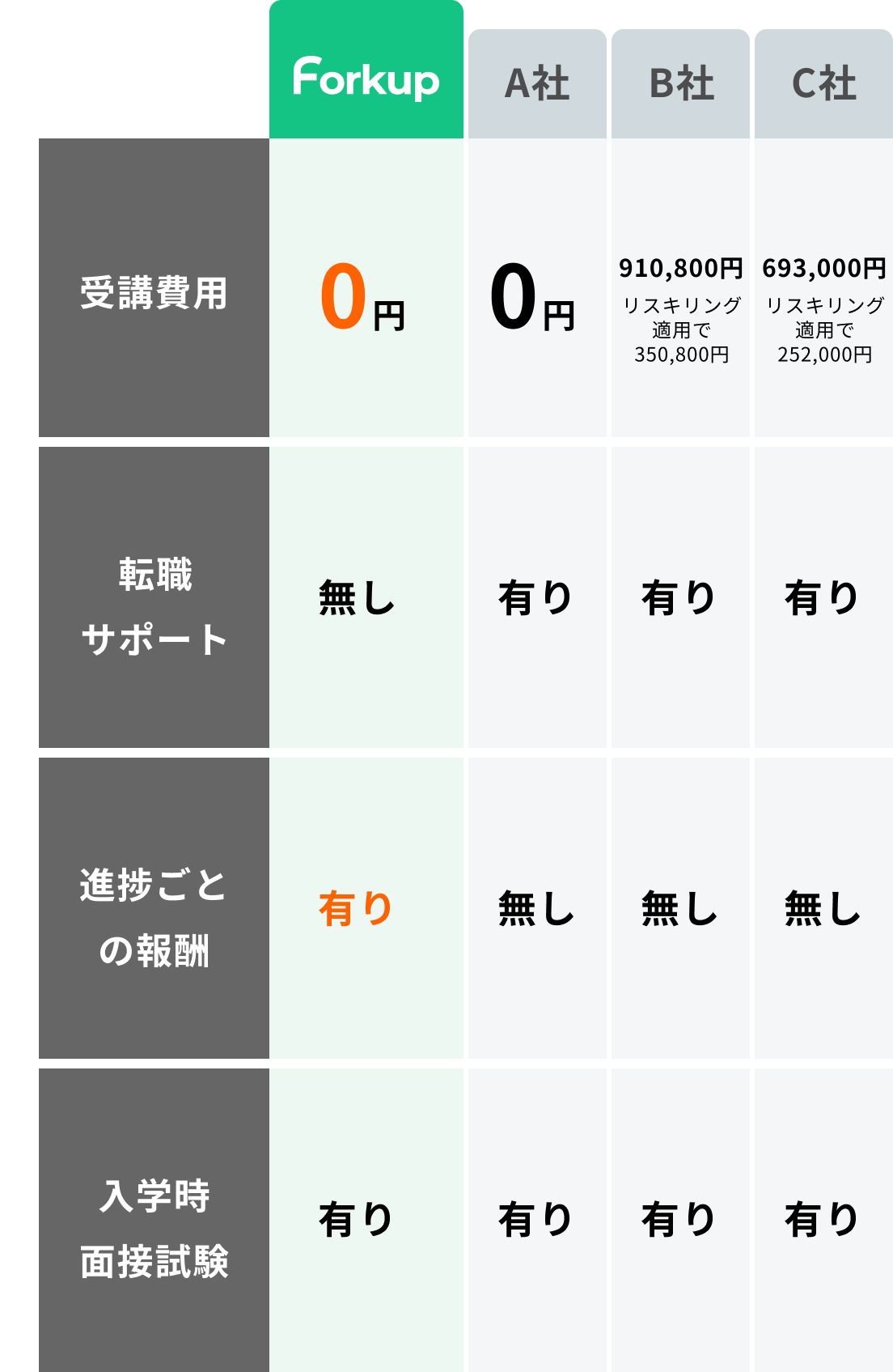 未経験からでも、 報酬を得ながら エンジニアに! 本気でエンジニアになりたい人がお金がなくてもゼロから挑戦できる!学びたい言語で学べる、完全無料のプログラミング学習サービス。 受講料不要 0円 学びながら 報酬 獲得 確実にエンジニアへ 実務経験 保証 ABOUT F orkup とは? プログラミングの学習を行い、カリキュラムの進捗ごとに学習成果に応じた報酬が支払われます。 学習終了後、弊社のエンジニアとしてご契約いただき、エンジニアとしての実績を積むことができるため、業務未経験のエンジニアとは大きく差をつけることが可能です。 いま、一歩が踏み出せない理由に こんな悩み、不安はありませんか? ブラック企業勤務していて、本当は辞めたいが無職になっての転職活動は経済的に厳しい。 勉強する時間がないから仕事を辞めるか迷っているが、あまり貯金を使いたくない。 大手のスクールに行くか迷っているけど、”転職保証付き”だと費用が高くて覚悟がきまらない… F orkup は、 経済的負担ゼロ! お金がネックでキャリアチェンジを諦めてしまっていた人のために作られました。 OUR STRENGTHS F orkup の強み 受講料無料+報酬を得ながら学習して、そのままエンジニアとして 案件に参加するので、現職が辞められない方も安心。 かかる費用を心配せずに学び始められる 受講料が無料なだけでなく、 稼ぎながら学べる! 学習にフルコミットする場合は現在お勤めの仕事を退職することが多いため経済状況によっては学習をあきらめてしまうケースがあります。受講中に受講者に報酬が支払える仕組みにより、経済状況に限らず誰でも勉強を始めることができます。 未経験からの転職に悩まない! そのままエンジニアの実績を 身に付けれる! 学習後は、弊社エンジニアとして案件に入り実績を積むことが可能です。スクールのように転職活動せず、即時案件に参加することができるので、学んだことをすぐに実践し、転職活動に有利な実績を積むことができます。今後フリーランスのエンジニアとして活躍していきたい方も、未経験のバッチが取れた状態で案件獲得に臨むことが可能です。 つまり、必要なのはやる気だけ。誰でもゼロから挑戦できます。 F orkup は、本気の人を 本気でサポートします。 未経験からでも報酬を得ながらエンジニアに! 2025 年 2 月生 受講者募集中! 【第一次 申込締切】 2025 年 1 月 31 日 (金) 23:59 まで 募集は終了しました 当講座に関する最新情報は、弊社公式Xアカウント @fed__corp にて発信しております。 次回の募集情報もこちらでお知らせいたします。 FEATURES F orkup 3つの特徴 日本全国どこからでも参加可能! 個人のペースと状況にあった方法で柔軟な学習が可能です。 01 完全オンライン可 自宅環境で学習可能。弊社オフィス近郊にいる場合は、直接オフィスに来て学習することもできます。 02 学習自由度の高さ 学習する言語やフレームワークに指定なし。将来的なキャリアも踏まえて、学習技術を一緒に選定します。 03 充実したカリキュラム 元メンターが集まって作成したオリジナルカリキュラム。監修だけでなく、カリキュラム作成にもしっかりと現役エンジニアの目が入っています。 FEATURES OUR CURRICULUM F orkup のカリキュラム 3~4か月間で基本的なスキルを習得。 その後、最短6か月間の実際の案件に従事し、実践力を鍛えます。 基礎学習 1~9のフェーズで基本から応用まで学習 ビジネスマナー実践 エンジニアとして案件に入るための知識を身に付ける 実務 学んだことを実践!6か月~、実際の案件を契約エンジニアとして受け持ち、実務を経験しながら実績をつけます。 卒業! ここがポイント! 技術的な学習だけでなく、ビジネスマナーも学習!ITエンジニアのコミュニケーションスキルや、問題解決志向のコミュニケーション、技術的内容の説明スキルなど、将来エンジニアとして独立して仕事を受注するのにも必要な知識を総合的に学ぶことができます。 ここがポイント! 先輩エンジニアの元、リモートでエンジニアとして業務委託で仕事をする感覚をつかむことができます。実績としても書くことができ、自信を身に付けることが可能です。 WHAT’S SPECIAL 他スクールとの違い 受講料0円なだけでなく、学習期間中から報酬が発生し、 エンジニアとして報酬を得ながら実務経験を積むことができるForkup。 他のスクールよりも一歩進んだ状態で転職活動ができるので安心です。 ここがポイント! 学習の進捗状況、案件参加状況に応じて報酬を獲得!仕事を辞めても収入があるから、経済的な心配が少ないForkup。勉強に120%集中できる環境が整っているので安心です。 MESSAGE 受講を考えてる方へ このページを訪れた皆様、初めまして。株式会社フェッドの代表、小林と申します。 もともと小学生の時からHTMLに触れて、趣味で個人のホームページを作成したり、インターネット黎明期から長い間Webに携わってきました。 新卒入社してしばらくし、とあるきっかけで某大手のプログラミングスクールの